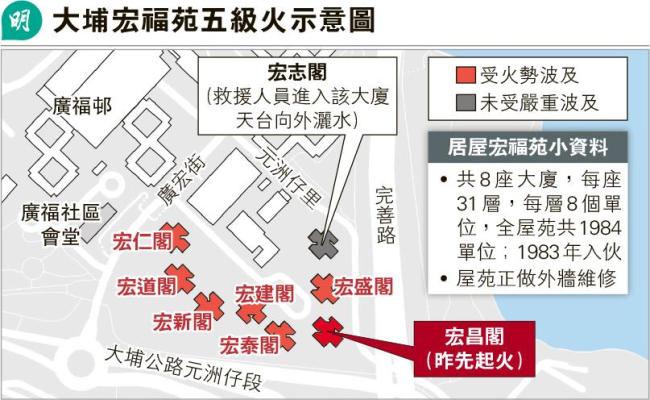 公开资料显示,宏福苑共8座大厦,每座有31层高,共有1984户居民。该住宅区于1983年落成,火灾发生时正在进行外墙翻修,被竹制脚手架和绿色防护网覆盖。多家港媒指出,现场片段显示,起火初期并没有火警声响起,火势沿棚架、棚网蔓延速度非常快。这令舆论指向宏福苑外墙搭建的维修竹棚,质疑其阻燃性。