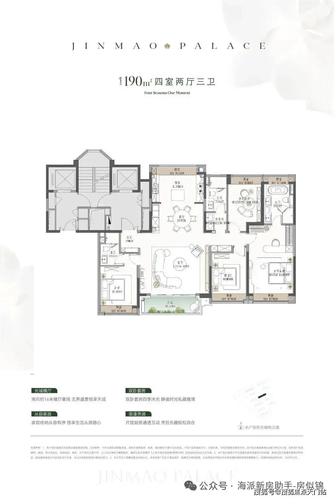● 建面约190㎡4房:楼王位置的顶奢大平层,同价位段在杨浦只能买到约120㎡3房!
